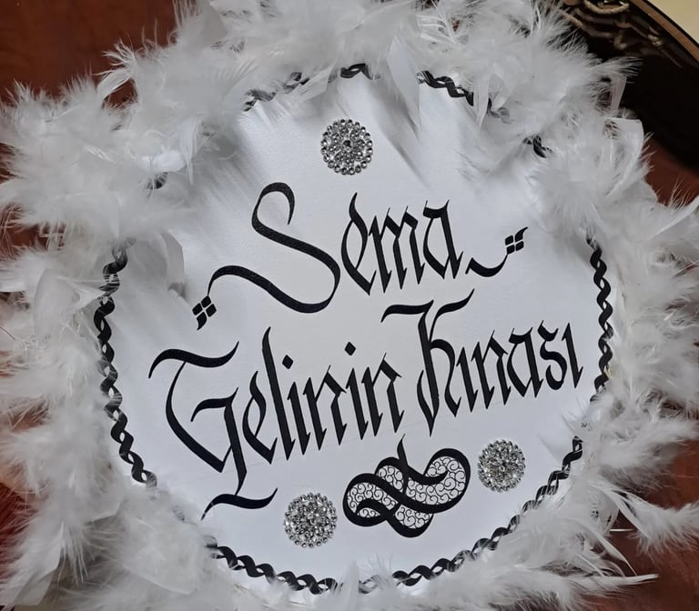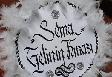 Kına gecelerinin vazgeçilmezi olan teflerinizin üzerlerine hat sanatı estetiğinde isimlerinizi yazıyoruz.